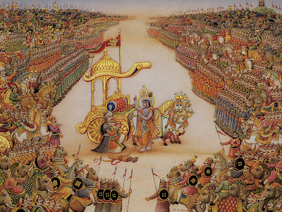 In the great cycle of the Mahabharata, the epic history of old India, spiritual teachings are set in the classic tradition of the teacher showing the disciple the path to true wisdom. At the heart of the epic is the Bhagavad Gita, the 'Song of God', in which Krishna teaches his warrior friend, Arjuna, who is presented with an awful dilemma: whether to fight in battle against his own relatives and dear friends, or to allow the forces of evil to over-run his kingdom. Taking this as a metaphor, Arjuna finds himself. He says to Krishna, "I'm confused; I'm frightened; I don't know what to do or who I can trust. Please advise me."